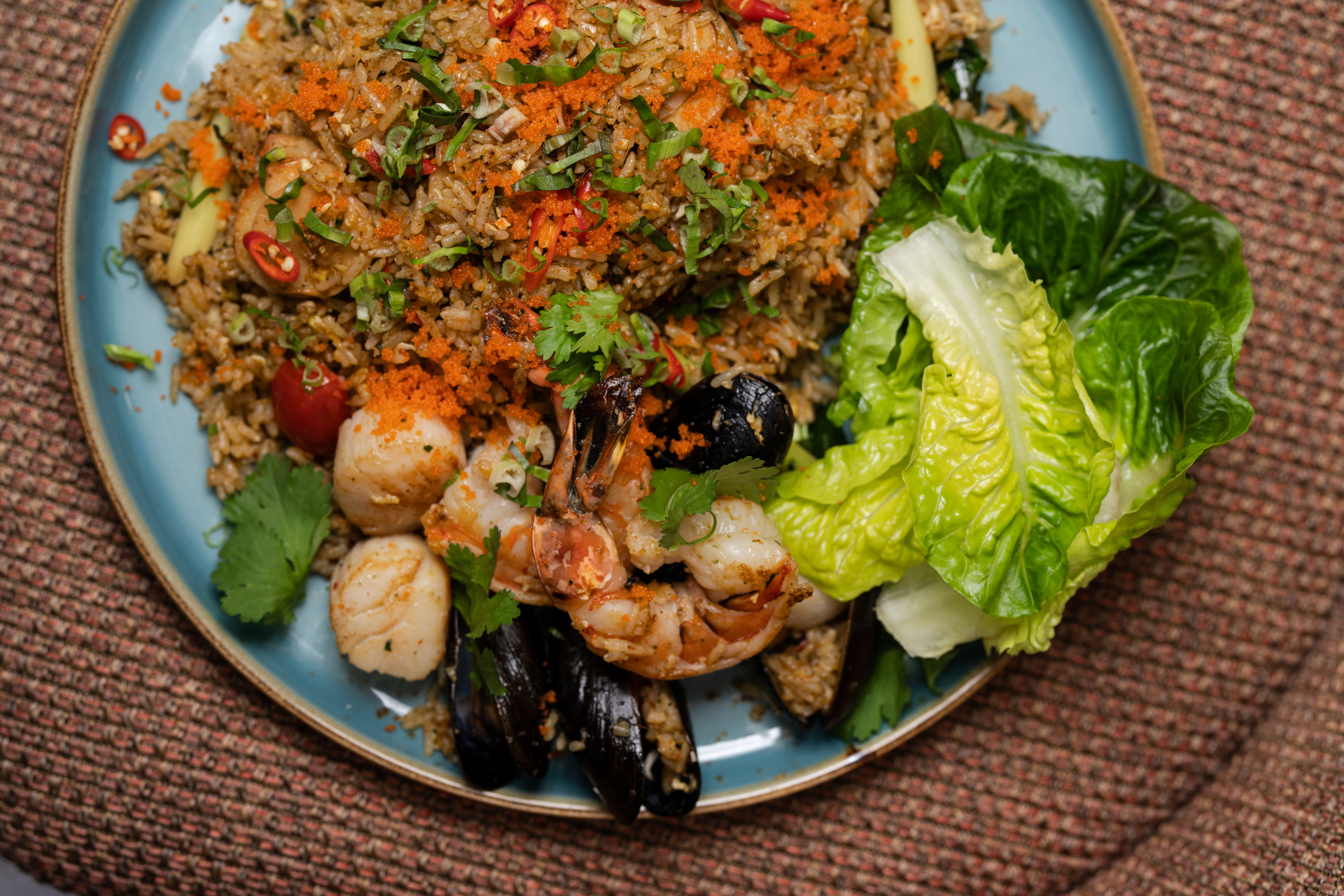 Tiger prawns, black mussels, scallops, fish roe, tom yum sauce, garlic, cilantro.